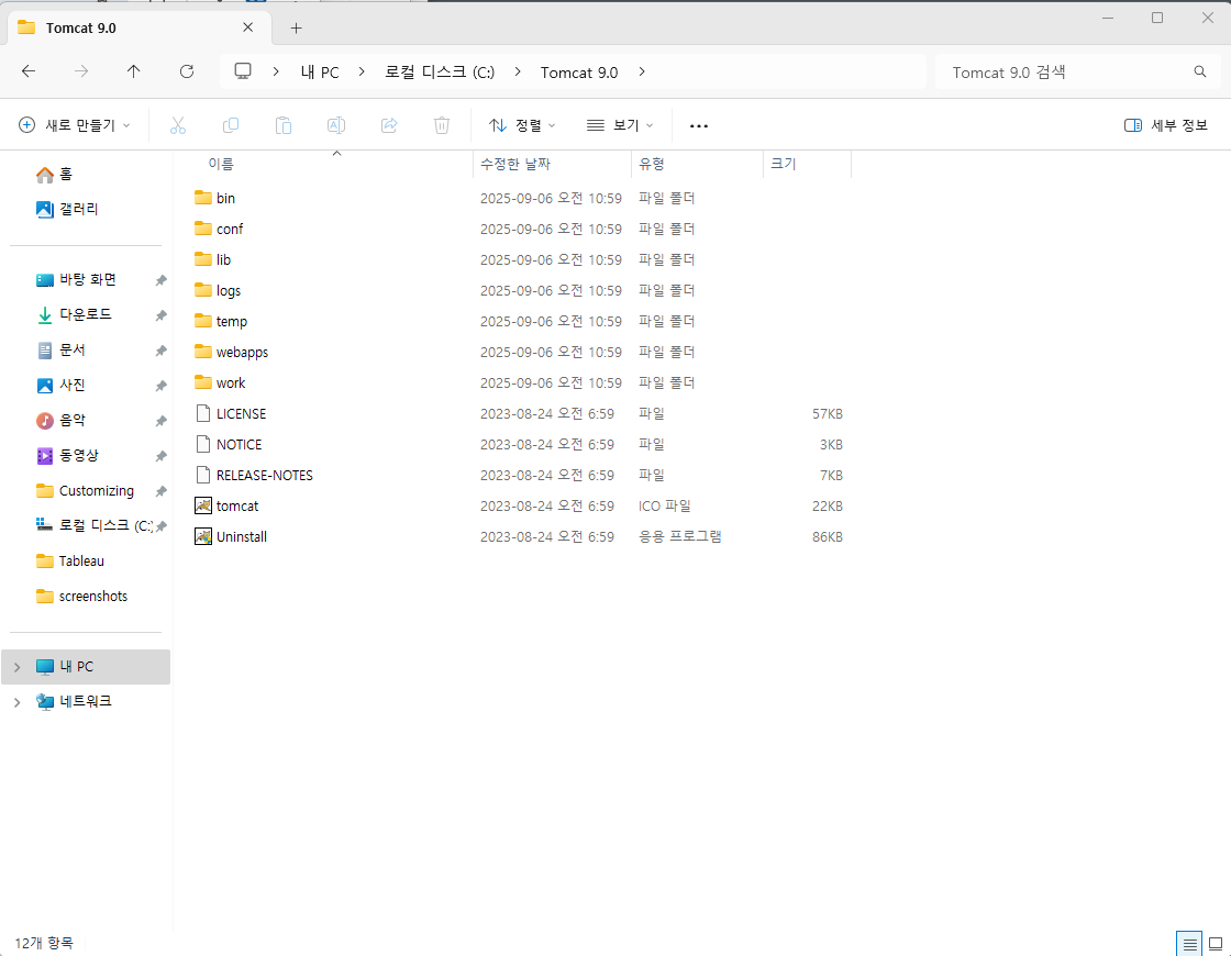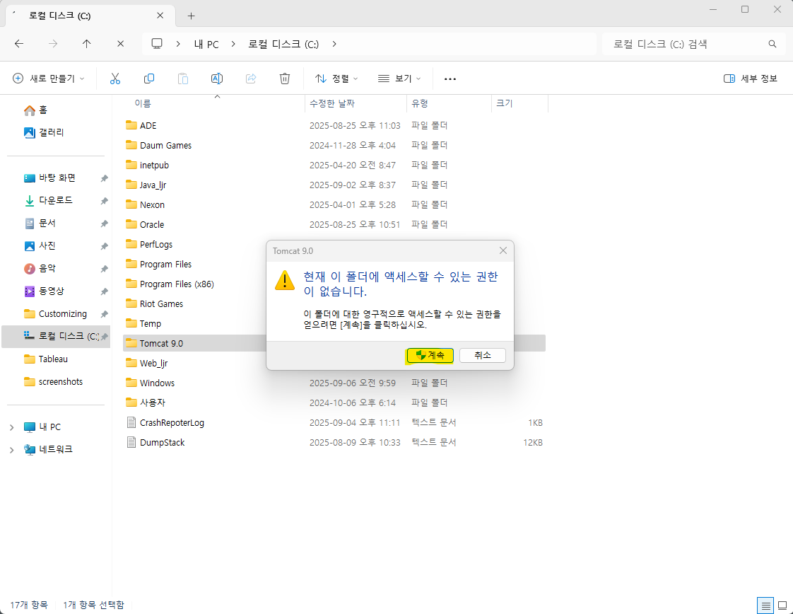 7. Tomcat 설치 한 폴더 안에 들어가주기, 경고창 계속 클릭
