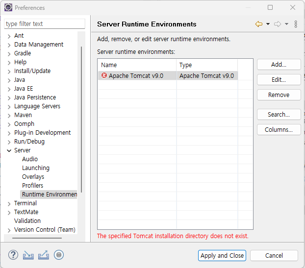 - Window > Preferences > Server > Runtime Environments