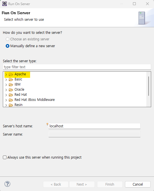 1. Apache 파일에서 설치했던 Tomcat v9.0 Server 선택
