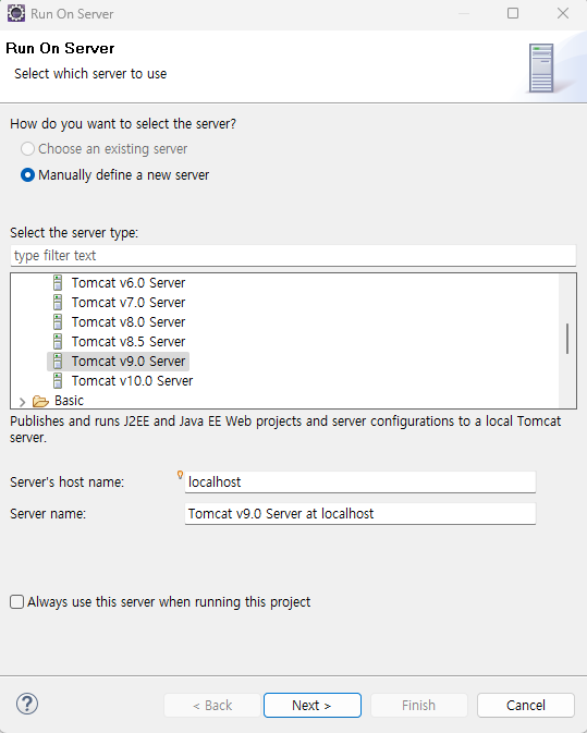 - HTML 파일 Run (실행) 하면 Run on Server창이 뜨면 Tocat v9.0 Server at localhost클릭 후 Finish