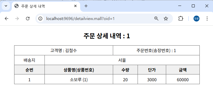 주문 상세 정보(상품명, 수량, 가격 등)를 함께 조회.