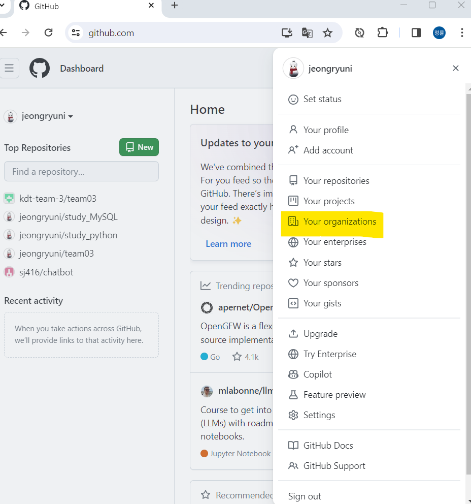 조직(Organization) 저장소에서 자신의 계정으로 프로젝트 복사본을 가져와 작업합니다.