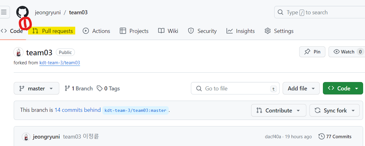 - 자신의 GitHub 레포지토리에서 Pull requests 탭 선택