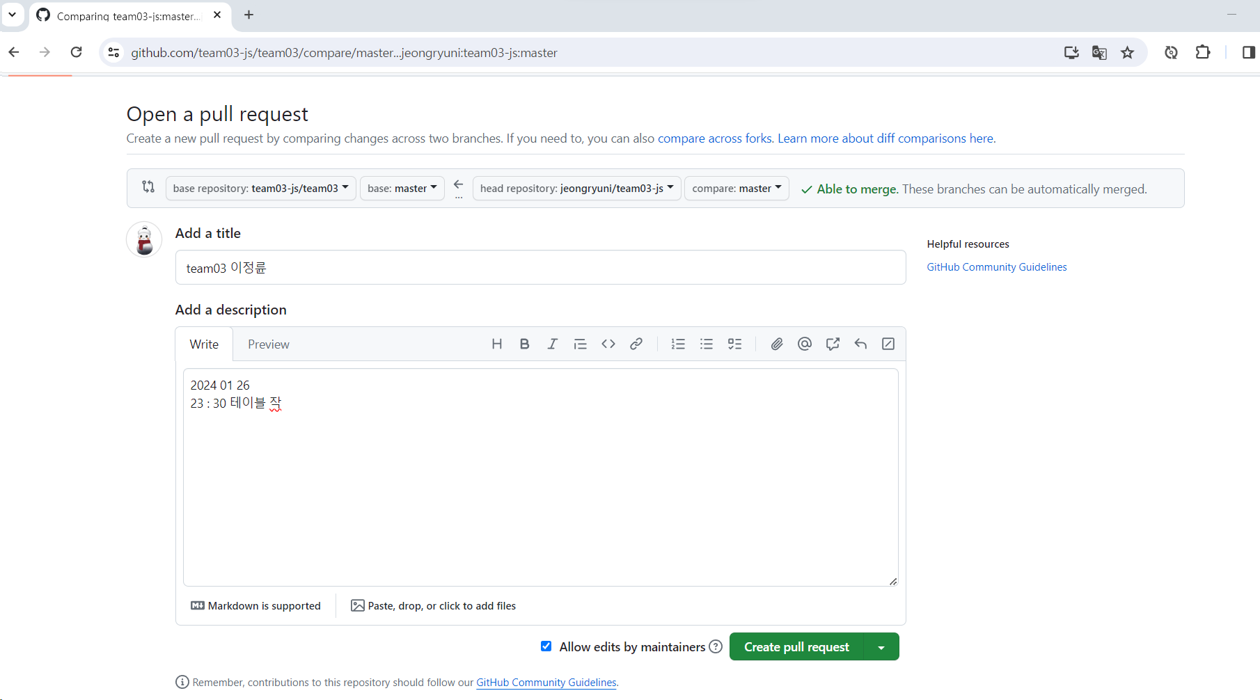 > Create pull reauest 클릭