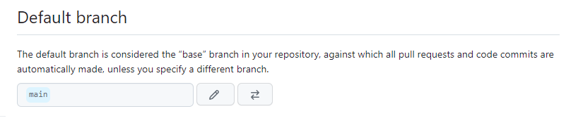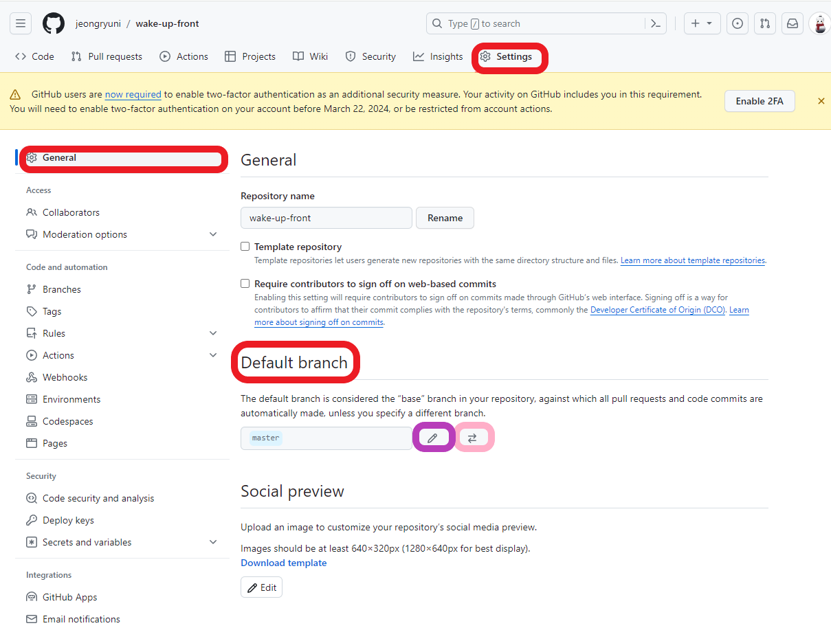 2-2) 핑크색 버튼 클릭시 default branch를 변경할 수 있다.