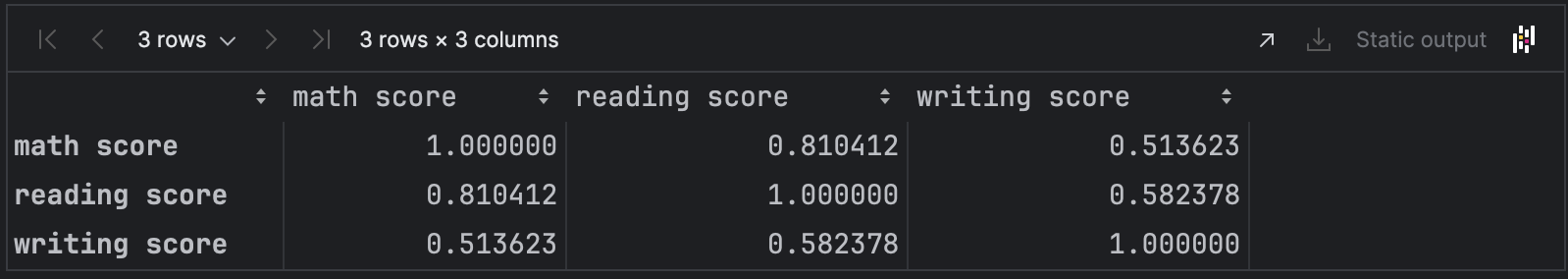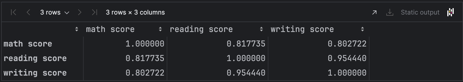 읽기와 쓰기는 0.95로 1에 매우 가까워 강한 양의 상관관계를 알 수있다.